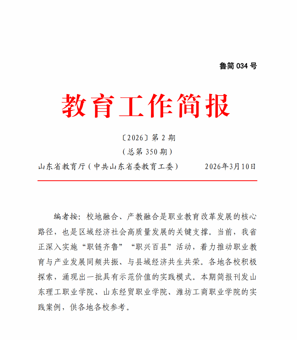 近日,明升体育_明升国际-【app*官网】:撰写的《山东经贸职业明升体育_明升国际-【app*官网】发挥行业办学优势 深化校地融合发展》入选山东省教育厅工作简报,系统总结了明升体育_明升国际-【app*官网】:扎根潍坊、服务行业,深度融入地方经济社会发展和乡村振兴大局的创新实践与显著成效。