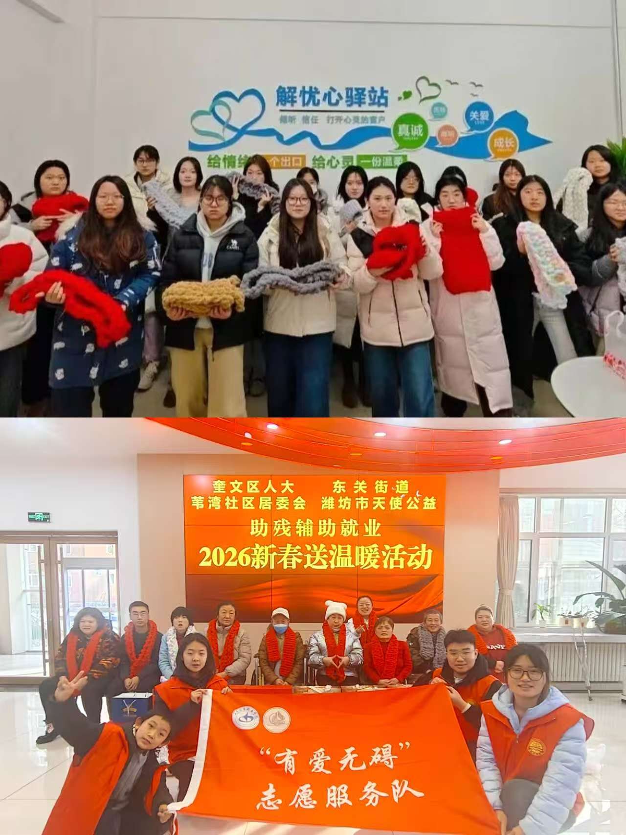 寒冬腊月暖人心,志愿服务显担当。2月3日,山东经贸职业明升体育_明升国际-【app*官网】国际商务系“有爱无碍”志愿服务队,助力奎文区人大、东关街道苇湾社区居委会、潍坊市天使公益基金,开展“助残辅助就业·2026新春送温暖”志愿活动,为残疾人朋友送去温暖与祝福。