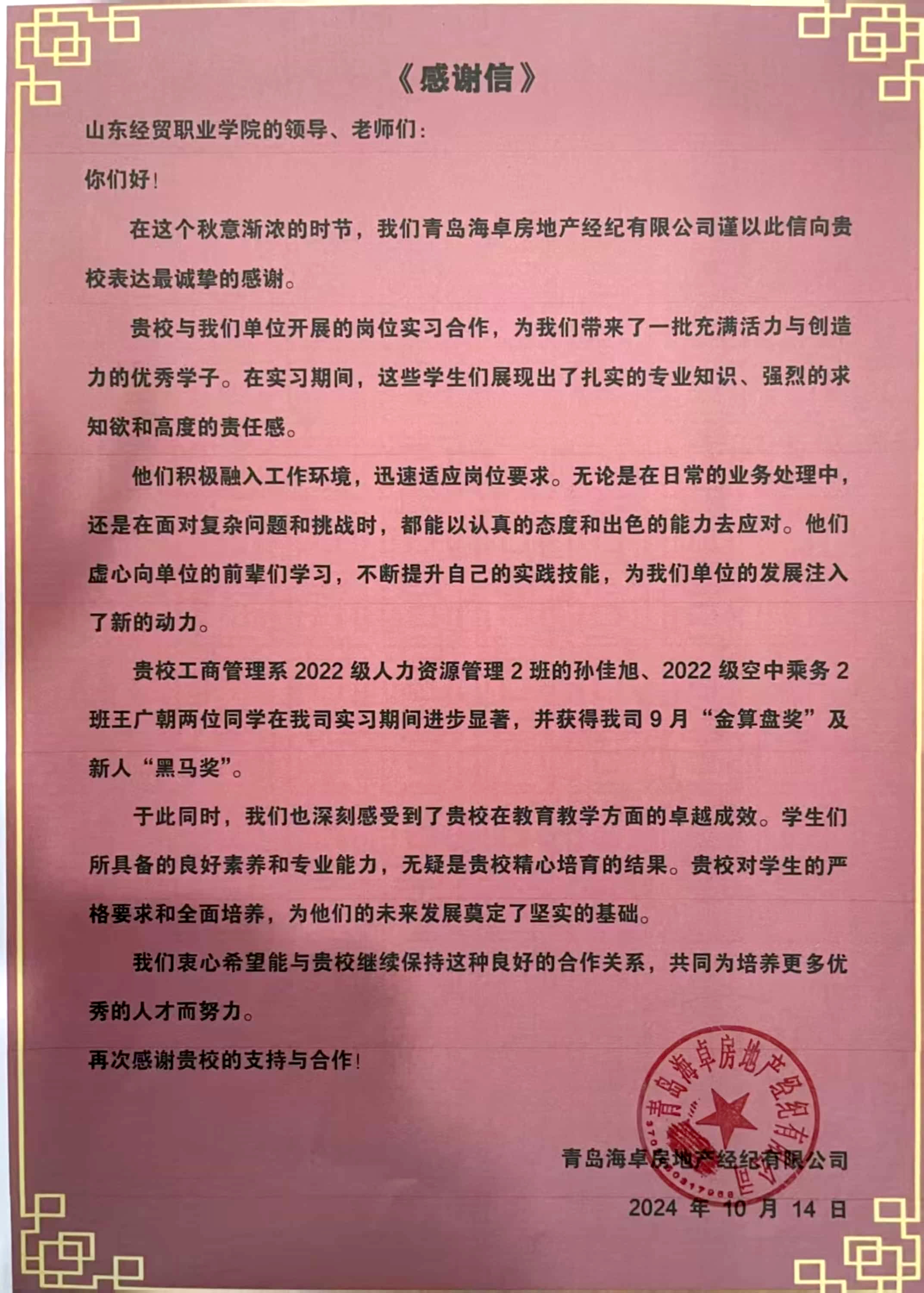 在青岛海卓房地产实习的同学得到了企业高度认可,工商管理系2022级人力资源管理2班孙佳旭同学8月初开始实习,从事房产营销管培生岗位工作,仅用2月时间销售业绩攀升至公司新人总积分第2名,获得企业“金算盘奖”;工商管理系2022级连锁经营管理班王憬龙同学和国际商务系2022级空中乘务2班王广朝同学获得企业“黑马奖”。