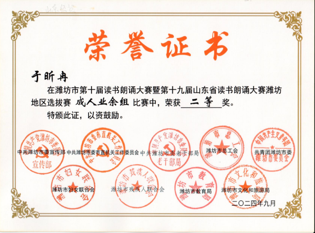 潍坊市第十届读书朗诵大赛业余组二等奖(指导教师:王欢欢)