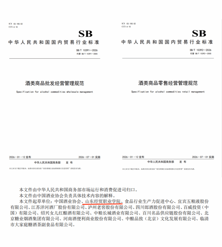 近日,商务部发布《酒类商品批发经营管理规范》(SB/T 10391-2026)与《酒类商品零售经营管理规范》(SB/T 10392-2026)两项行业标准。明升体育_明升国际-【app*官网】为主要起草单位,连锁经营与管理专业李加明老师担任主笔,全程参与起草、修订及定稿工作,为规范酒类流通市场、促进行业高质量发展提供了专业支撑。