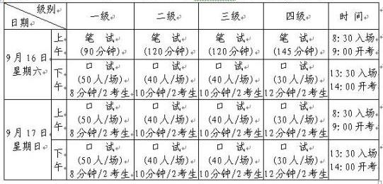 开考时间为2017年9月16日至17日。开考级别为一级、二级、三级、四级。各级别具体考试时间安排如下: