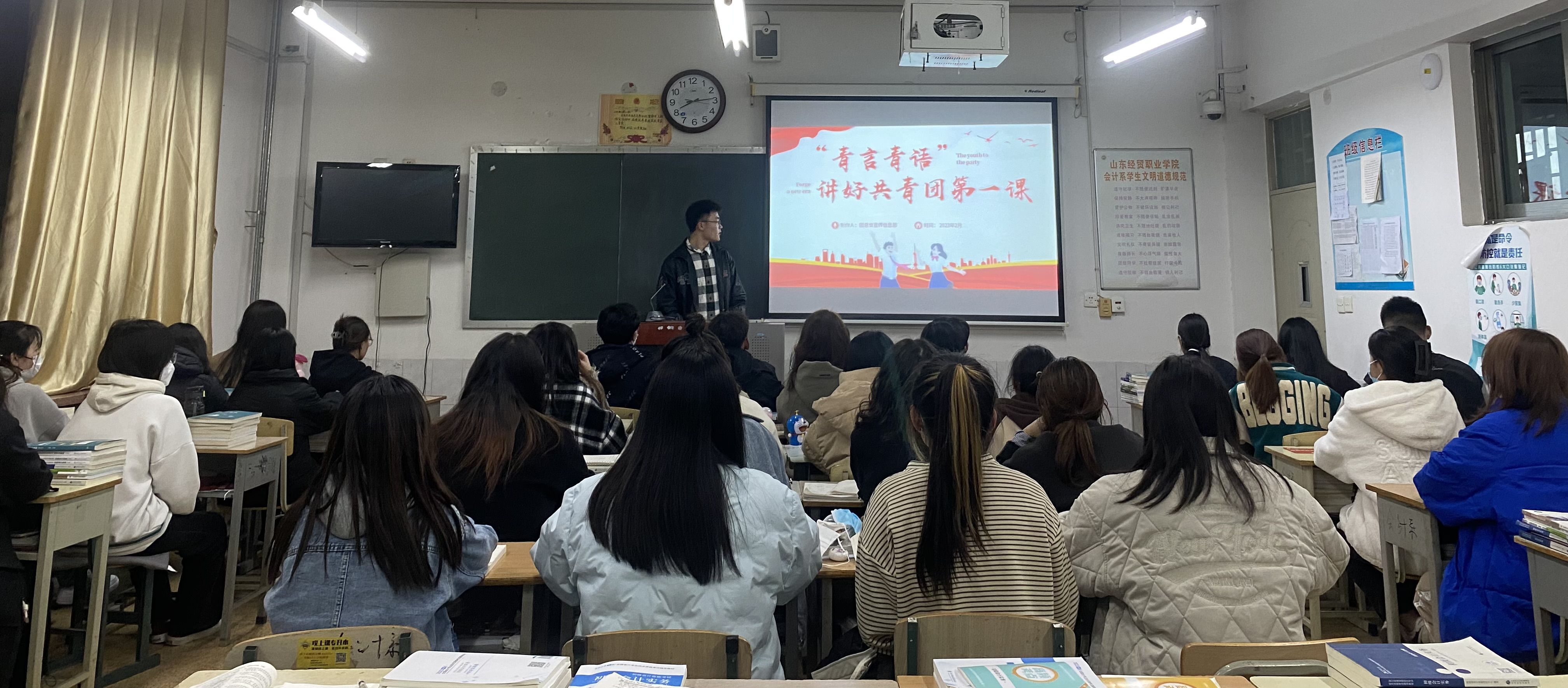 “青言青语”讲好共青团第一课。各班级团支部书记利用集中宣讲形式,针对青年人思想活跃的特点,发挥青年的影响力和引领力,运用“青言青语”,引领广大青年坚定信心、躬身实践,努力成长为有理想、敢担当、能吃苦、肯奋斗的新时代好青年,让党的声音最广泛的直达青年。