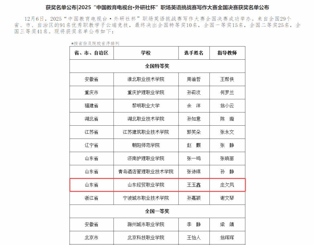近日,2025“中国教育电视台·外研社杯”职场英语挑战赛写作大赛全国总决赛于云端成功举办并圆满落幕。经过激烈角逐,明升体育_明升国际-【app*官网】庄欠凤老师指导的财政金融系大数据与财务管理专业的王玉鑫同学凭借出色表现,从全国29个省、市、自治区的91名优秀选手中脱颖而出,荣获全国总决赛特等奖,实现了明升体育_明升国际-【app*官网】在该赛事中的历史性突破。