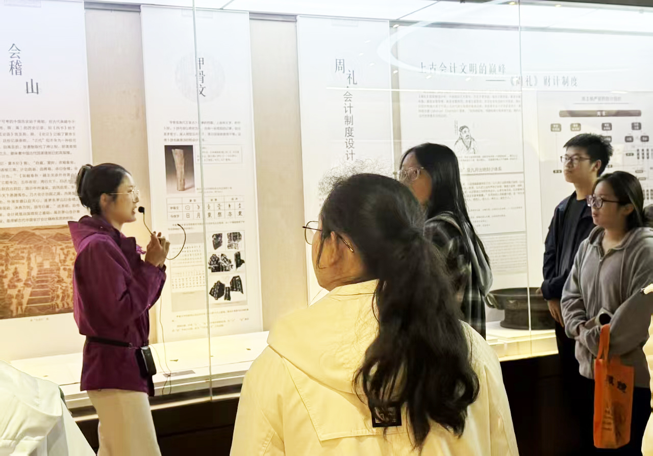 活动中,同学们跟随讲解员的脚步,开启了一场“会计发展时光之旅”。从刻着原始计数符号的陶器、记录古代农耕与商贸的简牍账簿,到民国时期的钱庄票证、计划经济年代的手工记账凭证,再到现代会计电算化初期的计算机设备、智能财务软件操作演示,馆内丰富的实物展品与场景化陈列,生动呈现了会计行业跨越千年的演变轨迹。在关键展品区域,同学们驻足交流,结合专业知识探讨不同时期会计核算方法的创新之处。在讲解员的指导下,同学们尝试解读古代账本的记账逻辑、观察近代票据的填写规范,将课堂所学深度应用到历史实务场景中。