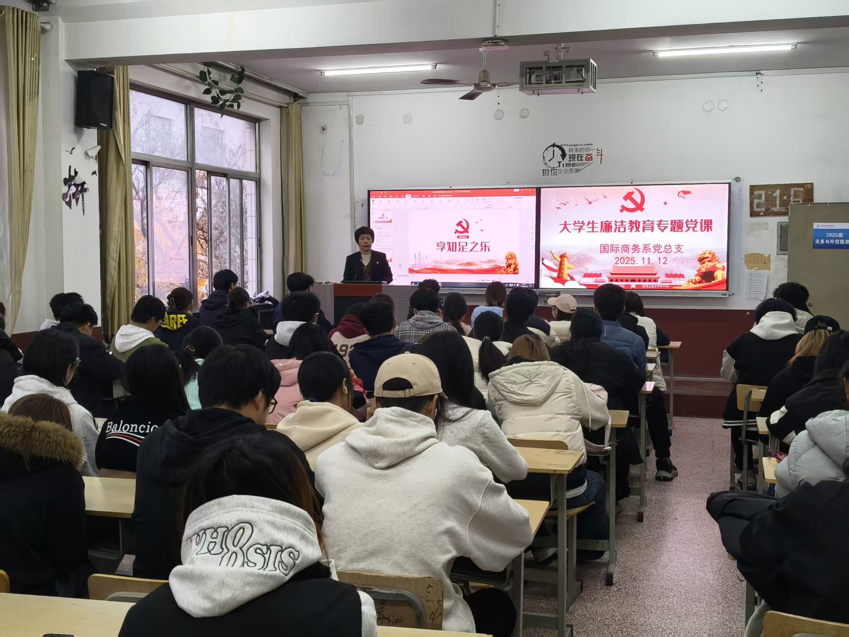 为深入推进清廉学校建设,强化学生廉洁自律意识与道德修养,筑牢青年学生思想防线,国际商务系于11月12日开展了党总支书记讲授“廉洁专题党课”暨学生干部培训会,2024级、2025级各班团支书、班长及学生会主要团学干部等六十余人参加。