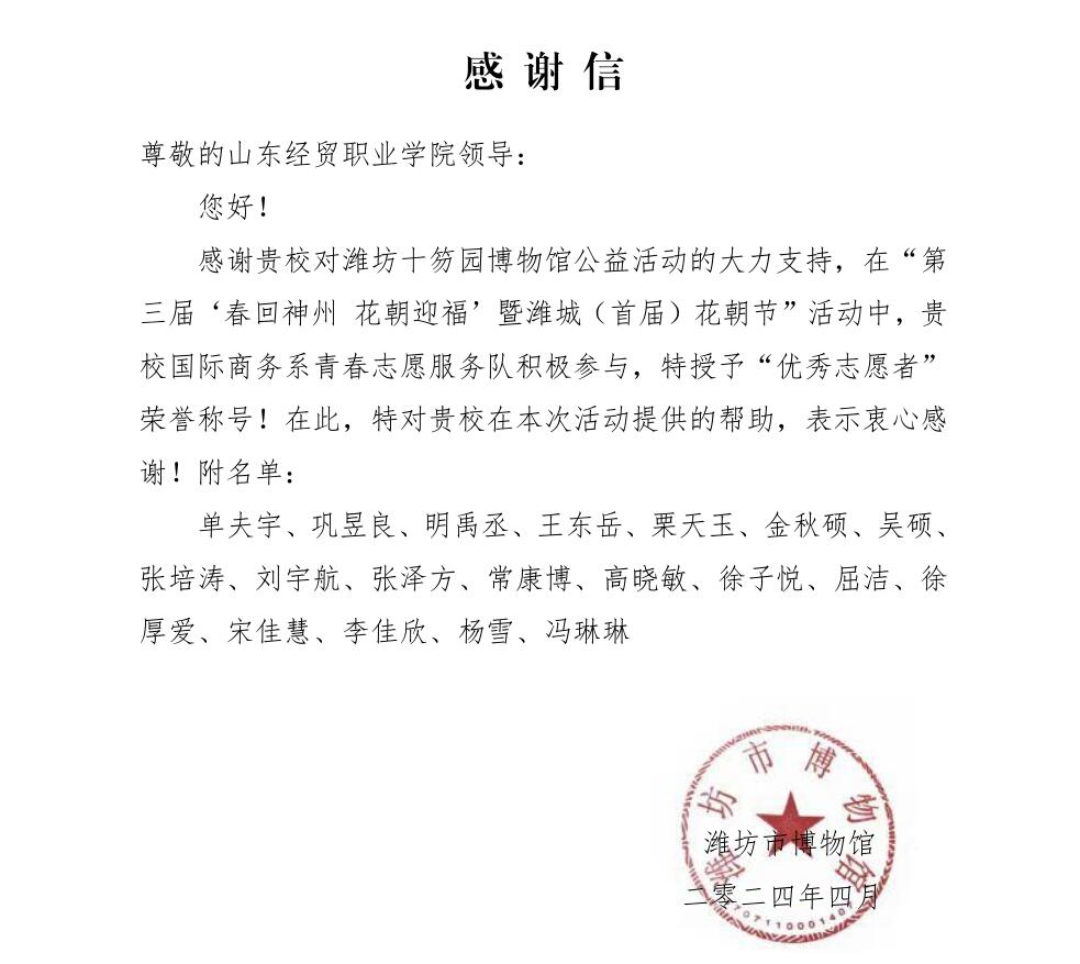 近日,潍坊市博物馆向明升体育_明升国际-【app*官网】发来感谢信,对明升体育_明升国际-【app*官网】:国际商务系青春志愿服务队积极参与潍坊十笏园博物馆的公益活动表示感谢,对积极参与“第三届‘春回神州 花朝迎福’暨潍城(首届)花朝节”活动的志愿者,2022级跨境电子商务1班班单夫宇等19名同学授予“优秀志愿者”荣誉称号。