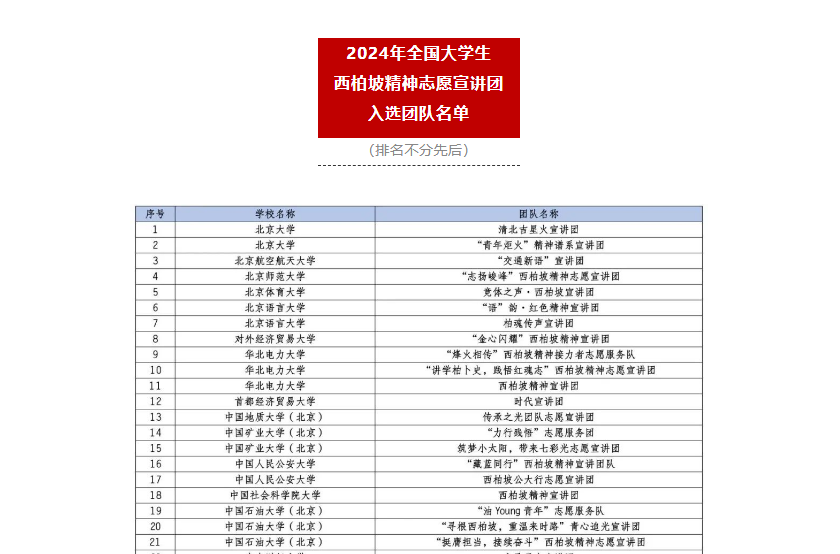 近日,共青团中央公布了本次宣讲活动入选团队名单,主办单位对所有材料进行了认真审阅,最终共有来自北京大学、南开大学、陕西师范大学等809所高校的1000支大学生志愿服务团队入选,工商管理系“星火”志愿服务队成功入选2024年全国大学生西柏坡精神志愿宣讲团。
