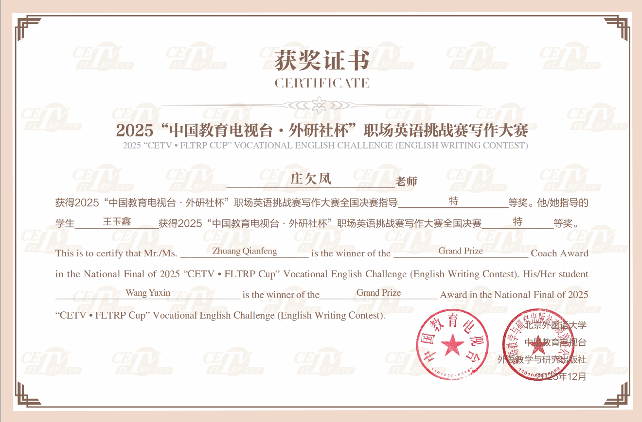 近日,在2025“中国教育电视台·外研社杯”职场英语挑战赛写作大赛全国总决赛中,明升体育_明升国际-【app*官网】庄欠凤老师指导的王玉鑫同学荣获全国总决赛特等奖。