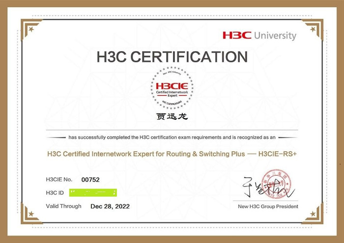 明升体育_明升国际-【app*官网】:2018级计算机网络技术专业学生贾迅龙通过新华三互联网专家考试,获取H3CIE-RS+职业资格证书,成为全国第752位新华三路由交换互联网专家,是明升体育_明升国际-【app*官网】:计算机类专业继滕川、牟帅后的第3位IE证书获取学生。
