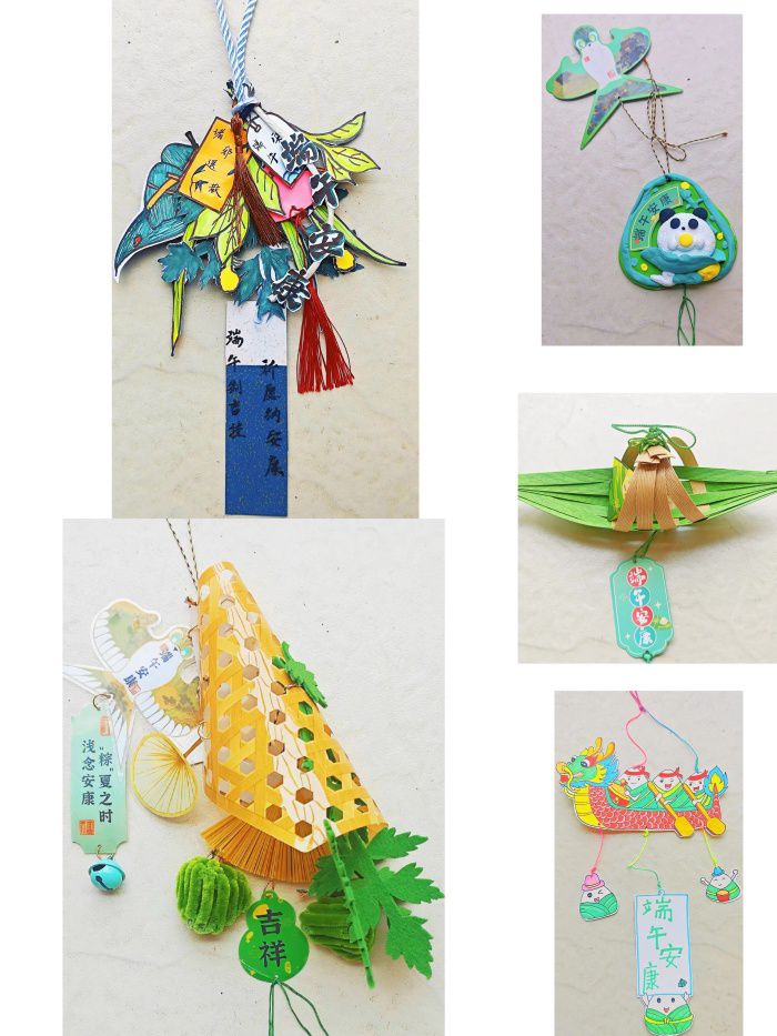 本次活动,参赛者们制作的精美挂件以不同的形式展现了中华传统文化独特的魅力。2023级大数据与会计校企合作2班刘小青同学的作品运用竹编、无纺布等可降解材料,通过创意组合呈现端午传统元素,兼具民俗韵味与环保理念;2024级会计信息管理1班刘玉卿的挂件以龙舟竞渡为核心,垂挂粽子吊饰,展现出祈福与祝愿的端午氛围;2024级大数据与会计IPO会计师学徒制班国俊颖的端午挂件设计精巧,以粽形为基础,彩泥塑造可爱熊猫,搭配清新底色与“端午安康” 文字,传统与萌趣兼具。