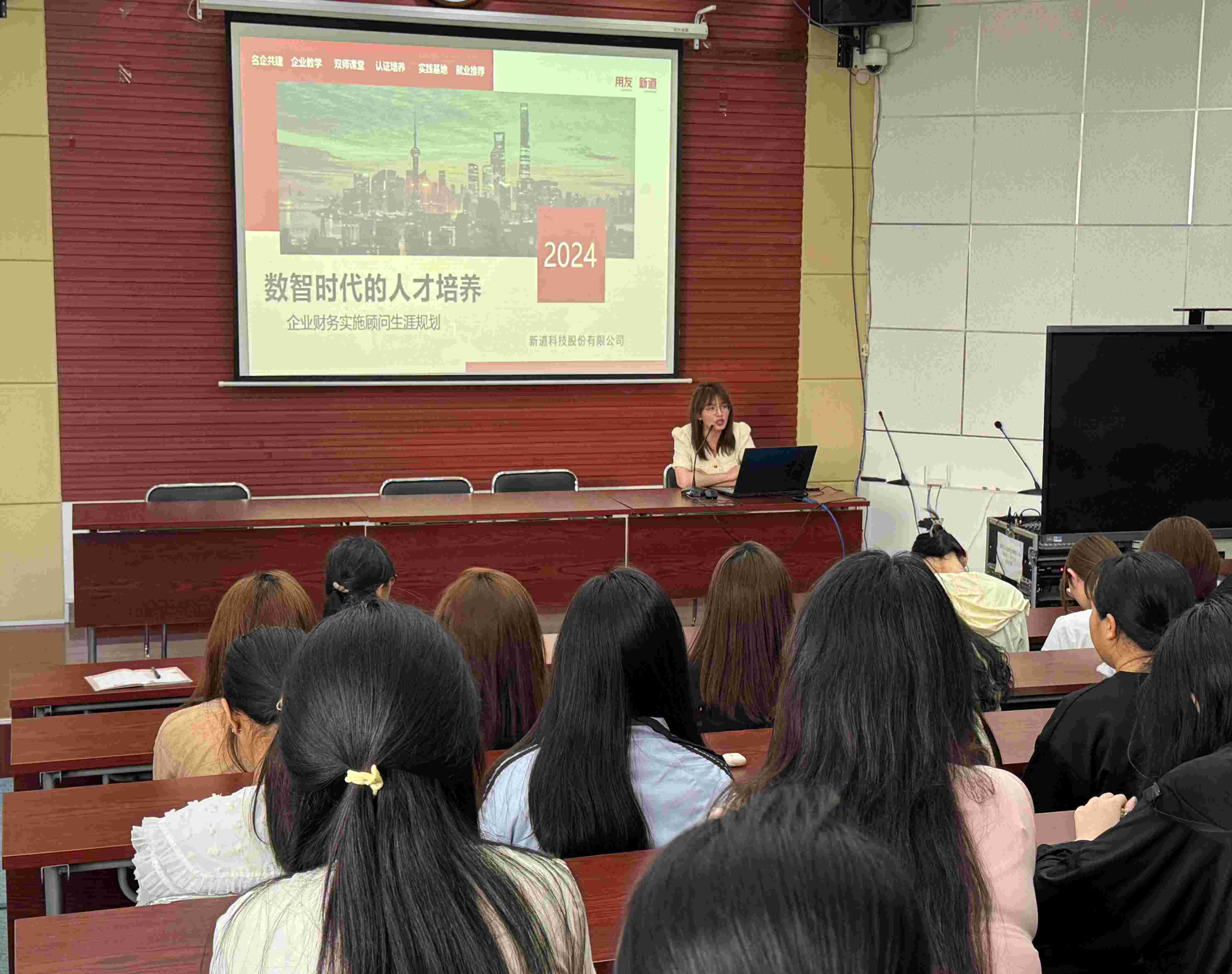 新道科技股份有限公司高级教学服务经理张昭君以“企业财务实施顾问生涯规划”为主题,从用友新道公司背景及合作企业介绍、岗位介绍、学到的能力及未来发展和就业前景四方面,为学生们详细解读了企业财务实施顾问岗位。她强调明确的目标和合理的规划是走向成功职业道路的关键。