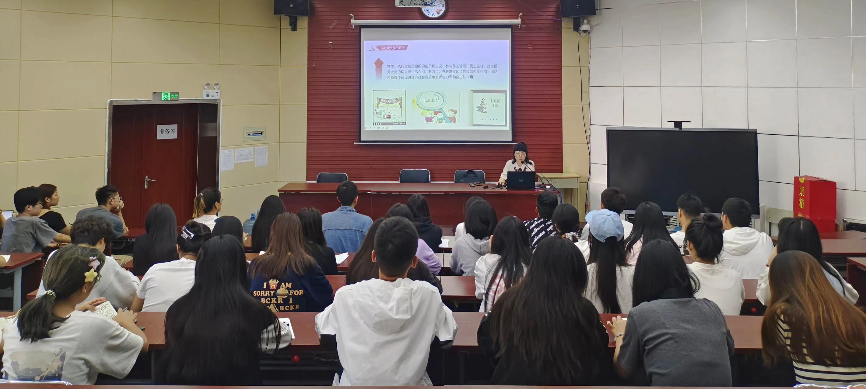王青青带领同学们进一步认识了共青团的性质和任务,学习了共青团中央印发的《中国共产主义青年团发展团员工作细则》、《明升体育:新时代新征程加强和改进团员队伍建设工作的意见》等文件。以“高校团支部相关概述”为主题,从高校团支部的性质与任务、工作原则和工作机制、工作制度及领导保障等三方面进行讲述,让同学们进一步了解了团支部是共青团的基层组织,是共青团团结教育青年的桥梁和纽带,是做好共青团工作的关键环节,是党支部的助手,要发挥好“三会两制一课”的作用,明确团支部工作的意义,从而有利于在各项工作实践中更加自觉的搞好共青团支部建设。