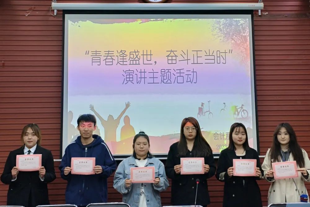 “青春逢盛世,奋斗正当时”演讲主题活动。活动现场,参赛者以“青春与奋斗”为主题,铿锵有力地将青春的梦想化作学习、生活、工作的奋斗目标,誓用青春梦共筑实现中华民族伟大复兴的中国梦而不懈奋斗。最终2022级会计信息管理班侯凤轩荣获一等奖;2022级大数据与会计3班孙亦菲、2021级统计与会计核算1班鲁炫利荣获二等奖;2022级统计与会计核算1班韩利、2021级大数据与会计2班李佳荟、2022级大数据与审计2班刘雨晴荣获三等奖。