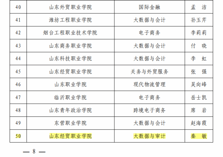 博士10人,硕士、博士占教师总数的90%以上,中高级职称占教师总数的90%以上,“双师型”教师比例达到100%。大数据与会计专业教学团队被评为省级教学团队、山东省职业教育教学创新团队、山东省高校黄大年式教师团队,大数据与审计专业教学团队为山东省职业教育教学创新团队,统计与会计核算专业教学团队为院级教学团队。