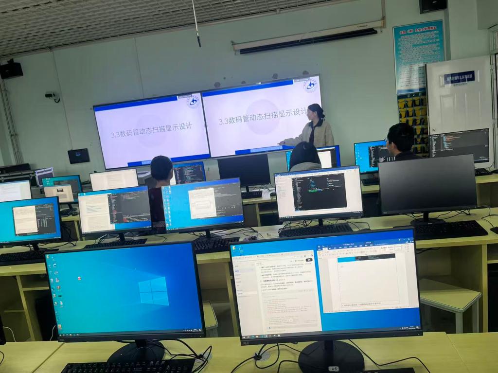 授课内容是嵌入式技术与应用开发课程中 “数码管动态扫描显示设计”。课堂上,陈新颖教师整个授课过程以任务驱动为核心,首先展示了任务实现效果,明确了任务的知识与技能目标、情感态度目标,以及任务的重点难点;通过提问学生回顾数码管静态显示相关知识,引出动态扫描显示的需求,分析动态扫描显示的原理,详细讲解电路核心组件的作用与电路连接逻辑;之后与学生一起推进任务实现,包括展示任务单明确要求,梳理电路搭建(Proteus 软件操作)和程序设计(Keil μVision5 环境下)的思路,强调引脚对应、延时设置等注意事项,组织学生实操完成电路搭建与程序编写、编译、调试,提出修改显示数字序列的课外扩展任务;最后总结反思,梳理动态扫描显示的核心要点与实操关键步骤,反思学生在电路连线、程序调试中易出现的问题及后续指导对策。